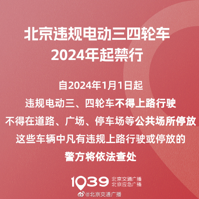 2022年,北京市共發(fā)生違規(guī)電動(dòng)三、四輪車交通事故131起,死亡138人。市交管局于4月12日再次強(qiáng)調(diào),自2024年1月1日起,違規(guī)電動(dòng)三、四輪車不得上路行駛,不得在道路、廣場(chǎng)、停車場(chǎng)等公共場(chǎng)所停放。這些車輛中凡有違規(guī)上路行駛或停放的,警方將依法查處。