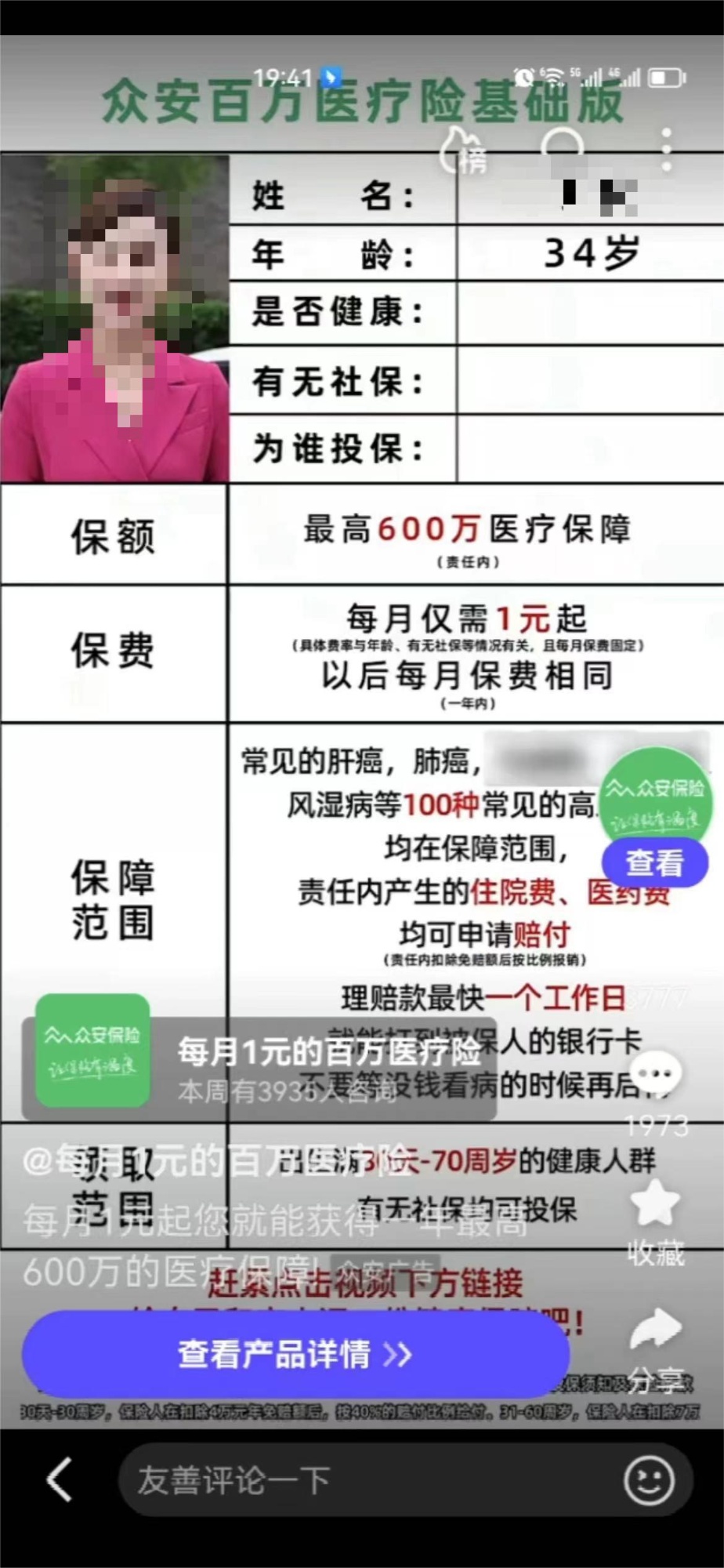 眾安保險(xiǎn)在視頻廣告上稱每月保費(fèi)1元起(央廣網(wǎng)發(fā) 記者截圖)