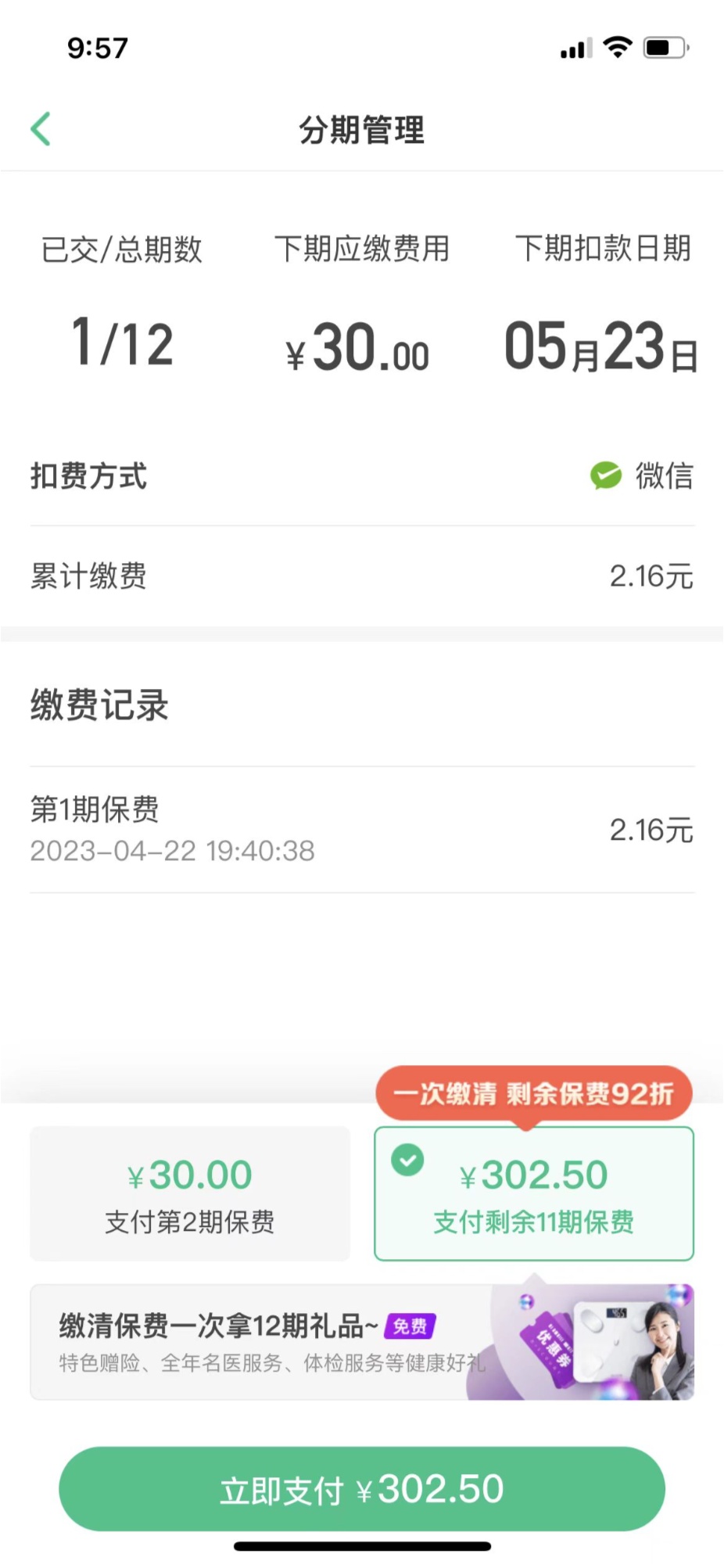 記者在眾安保險(xiǎn)App的保單頁(yè)面中看到,所購(gòu)保險(xiǎn)名為“眾安百萬(wàn)醫(yī)療保險(xiǎn)2022版”,點(diǎn)擊保單頁(yè)中的“去繳費(fèi)”選項(xiàng),該保單為期一年,目前累計(jì)繳費(fèi)2.16元,但下期應(yīng)繳費(fèi)用已變?yōu)?0元。