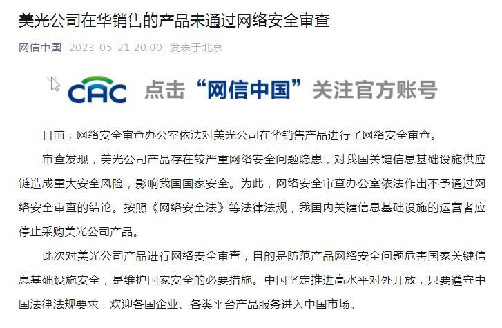 美光公司在華銷售的產(chǎn)品未通過網(wǎng)絡(luò)安全審查