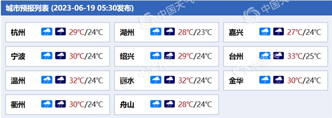 后天,浙北地區(qū)多云到陰,午后局部有陣雨或雷雨;浙中南地區(qū)陰有陣雨或雷雨。 以上有雷雨地區(qū)局部可伴有短時暴雨和個別8-10級雷雨大風(fēng)。