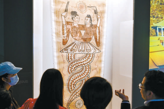 “交融匯聚——新疆精品歷史文物展”近日在國家博物館開幕。展覽展出新疆精品歷史文物209件(組),展現新疆各民族交往交流交融的歷史事實。圖為觀眾欣賞伏羲女媧絹畫。 本報記者 鄧偉攝