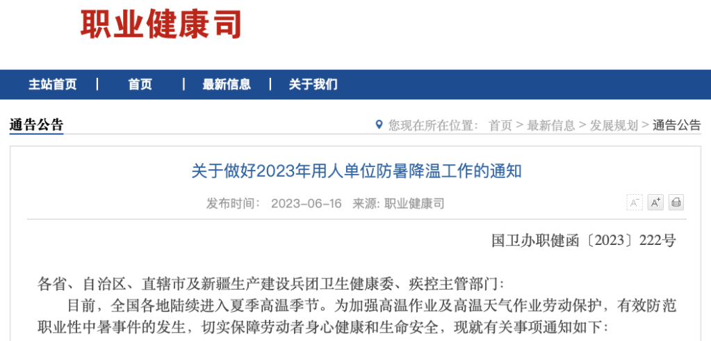 通知指出,目前,全國各地陸續(xù)進入夏季高溫季節(jié)。近年來,夏季高溫作業(yè)及高溫天氣作業(yè)導(dǎo)致勞動者中暑死亡的事件時有發(fā)生,對勞動者身心健康和生命安全造成嚴重威脅。各級衛(wèi)生健康行政部門和疾控主管部門要進一步明確工作責(zé)任,加強組織領(lǐng)導(dǎo),系統(tǒng)謀劃部署,協(xié)同推進用人單位防暑降溫工作和各項職業(yè)病預(yù)防工作。