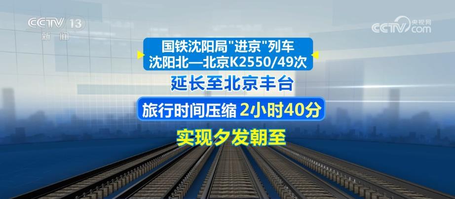 此次調(diào)圖,國鐵沈陽局“進(jìn)京”列車沈陽北—北京K2550/49次延長至北京豐臺,旅行時間壓縮2小時40分,實現(xiàn)夕發(fā)朝至。