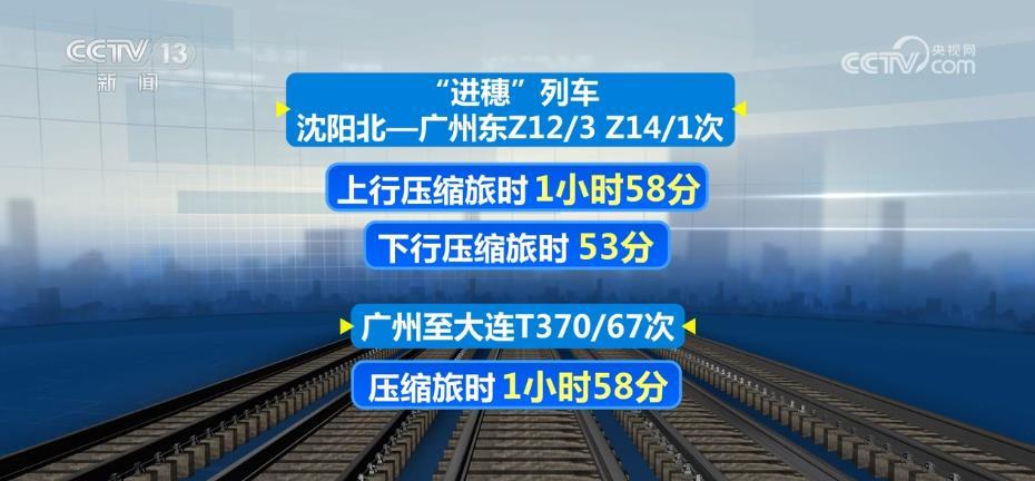 “進(jìn)穗”列車沈陽北—廣州東Z12/3、Z14/1次上行壓縮旅時1小時58分,下行壓縮旅時53分,廣州—大連T370/67次壓縮旅時1小時58分。