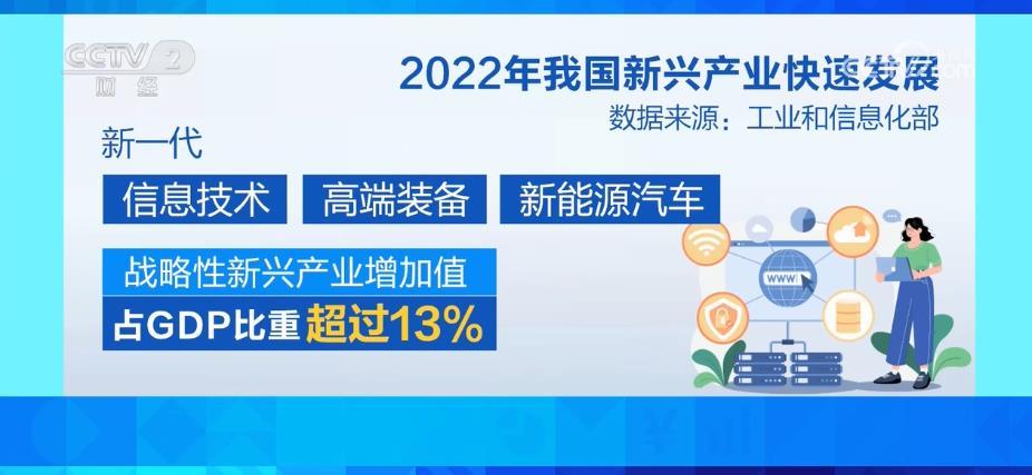 工業(yè)和信息化部部長金壯龍介紹,2022年,我國新一代信息技術(shù)、高端裝備、新能源汽車等戰(zhàn)略性新興產(chǎn)業(yè)增加值占GDP比重超過13%。