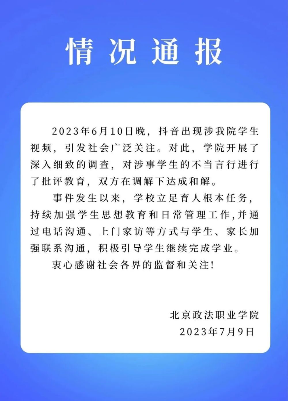 同時,據(jù)北京政法職業(yè)學院,6月10日晚,抖音出現(xiàn)涉該院學生視頻,引發(fā)社會廣泛關(guān)注。對此,學院開展了深入細致的調(diào)查,對涉事學生的不當言行進行了批評教育,雙方在調(diào)解下達成和解。