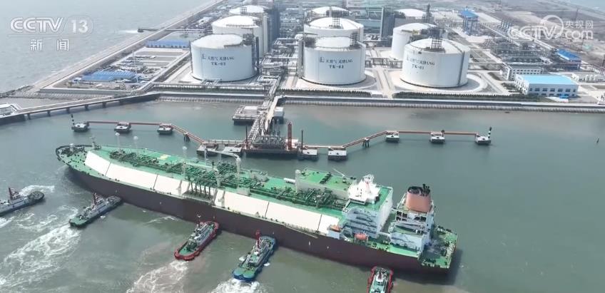 在天津,一艘滿載9萬噸液化天然氣的運(yùn)輸船在中國石化天津液化天然氣接收站碼頭接卸,這是該站自6月以來接卸的第8船。