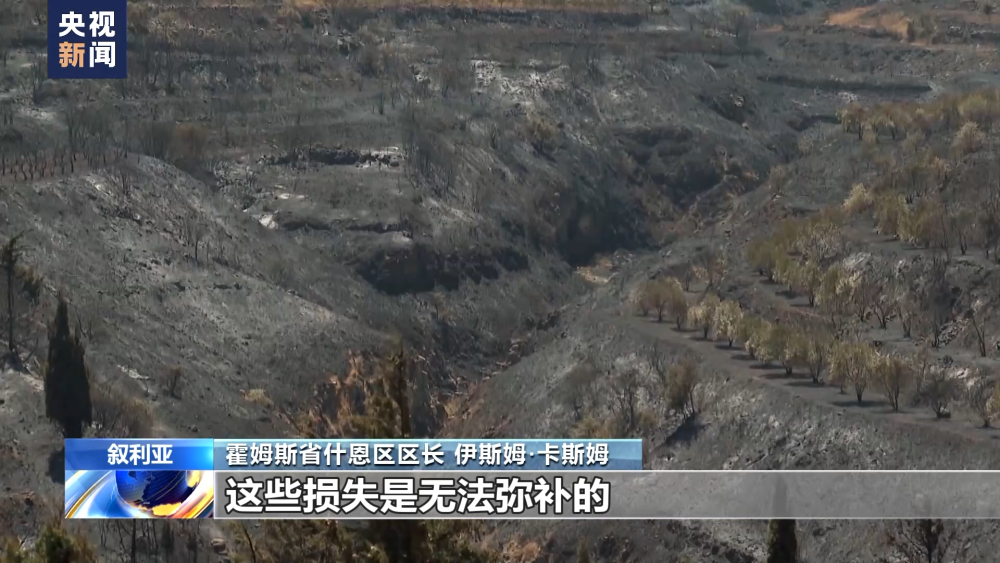 霍姆斯省什恩區(qū)區(qū)長(zhǎng) 伊斯姆·卡斯姆:大火蔓延了約430平方公里,這里種植了橄欖、蘋(píng)果、葡萄、無(wú)花果樹(shù)等,損失非常巨大。我們可以看到橄欖樹(shù)都被燒焦了,果農(nóng)損失了大概20年的橄欖產(chǎn)量,這個(gè)地區(qū)往年能產(chǎn)出約1.6萬(wàn)升的橄欖油,約1.6萬(wàn)升的蘋(píng)果醋,還有蘋(píng)果都能出口到鄰國(guó)。今年我們將面臨橄欖油和蘋(píng)果產(chǎn)量降低,這些損失是無(wú)法彌補(bǔ)的。