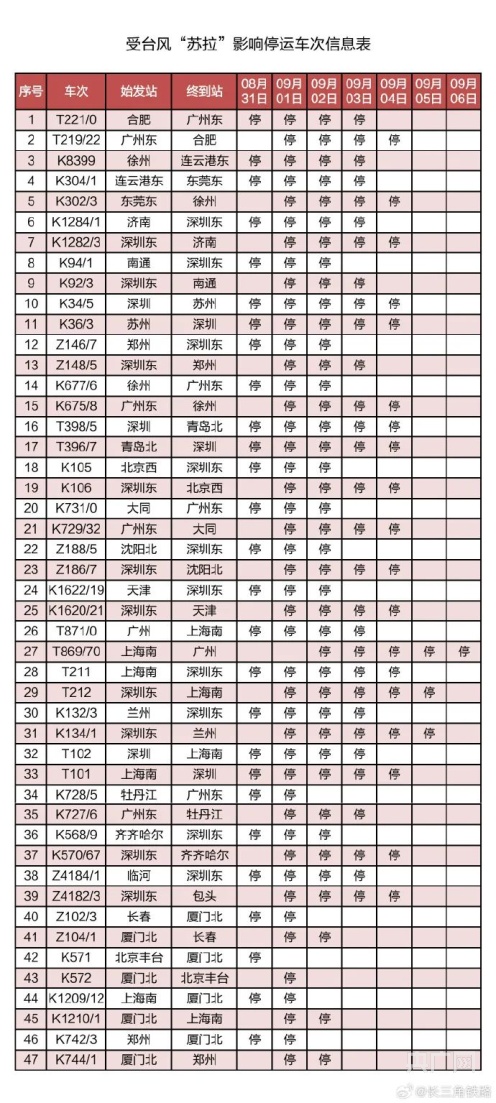 記者從中國鐵路上海局集團有限公司獲悉,受第9號臺風“蘇拉”影響,為確保列車運行安全,鐵路部門計劃對杭深線、京港高鐵、廣深城際、廣深港高鐵、穗深城際、京九線等線路運行的部分列車采取停運措施。截至30日17時30分,計劃停運8月31日至9月6日間共121趟旅客列車:其中停運動車組列車74趟,停運普速列車47趟。