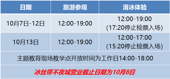 10月7日至10月12日,旅游參觀和滑冰體驗開放時間為12:00-19:00,滑冰體驗停止檢票入場時間為17:20。