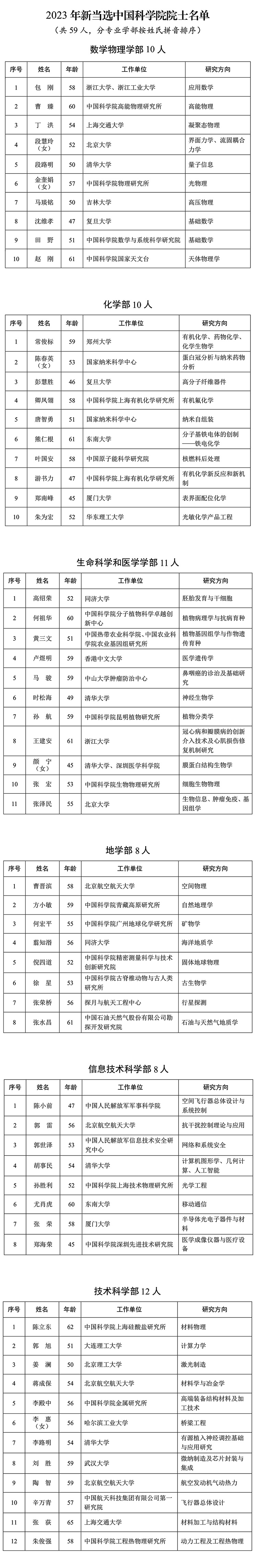 2023年新當(dāng)選中國(guó)科學(xué)院院士名單