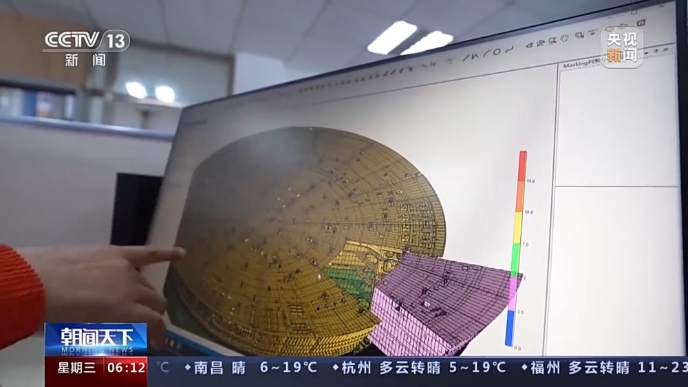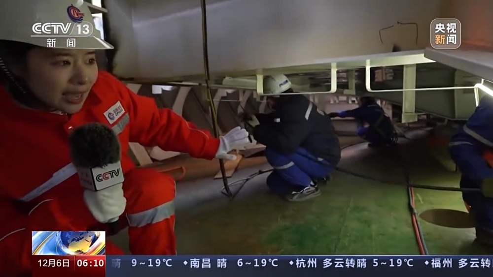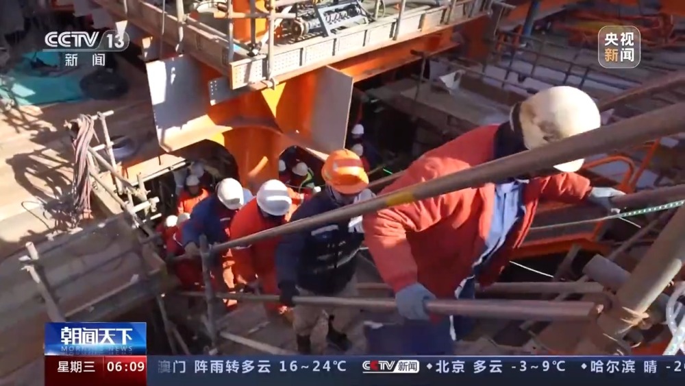 總臺央視記者 張叢婧:可以看到能源碗里的空間非常狹窄,因為這些模塊由幾十萬個零部件組成,集成度很高,我們現(xiàn)在進一個施工現(xiàn)場里看一下。工人師傅們正在這里鋪設電纜,他們都是要蹲著,像這樣挪動才能夠完成這些操作。我發(fā)現(xiàn)其實像這樣的高難度施工,幾乎涉及所有的工種。