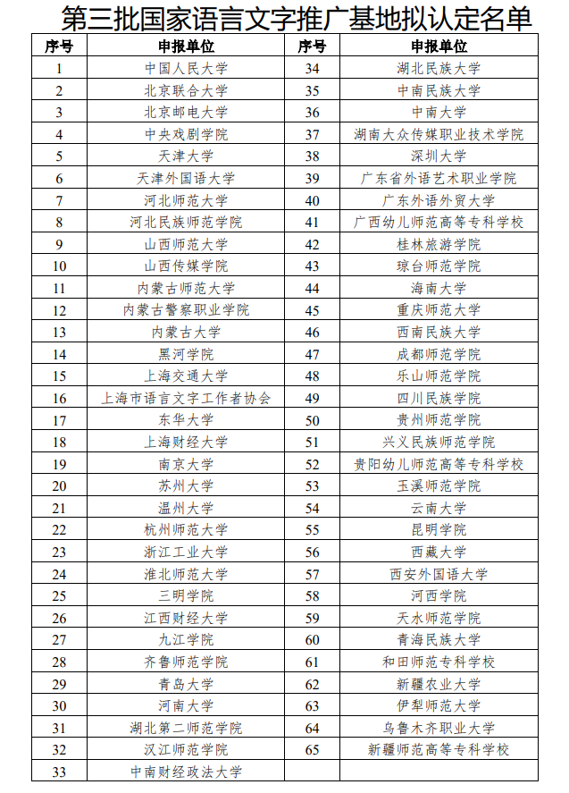 央廣網北京12月13日消息(記者 馮儀) 為深入貫徹落實黨的二十大、二十屆二中全會精神,落實《國務院辦公廳關于全面加強新時代語言文字工作的意見》,加大國家通用語言文字推廣力度,發(fā)揮國家語言文字推廣基地(以下簡稱推廣基地)支撐作用,根據《國家語言文字工作委員會關于印發(fā)〈國家語言文字推廣基地管理辦法〉的通知》(國語〔2022〕3號),按照教育部評審競賽管理要求,教育部、國家語委組織開展了第三批推廣基地申報評審工作。經全國各省級教育(語言文字工作)部門遴選推薦、專家評審、實地考察、綜合評議等程序,擬認定中國人民大學等65家單位為第三批推廣基地。