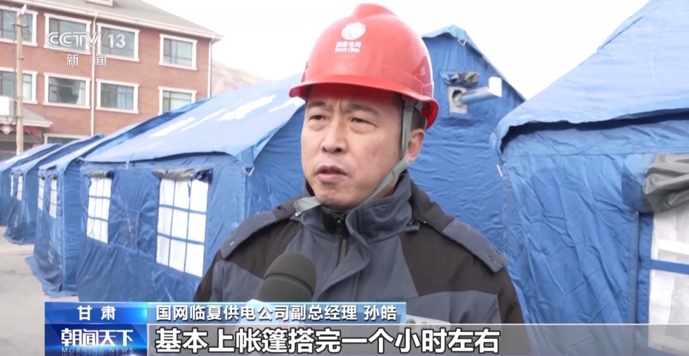 國網(wǎng)臨夏供電公司副總經(jīng)理 孫皓:基本上帳篷搭完一個小時左右,我們就能把電通上,因為每個點我們都有3到10名工作人員在跟進(jìn),充分地調(diào)動了我們所有的人員和力量,把這項工作放在最重要的位置上,把老百姓的電先供好。