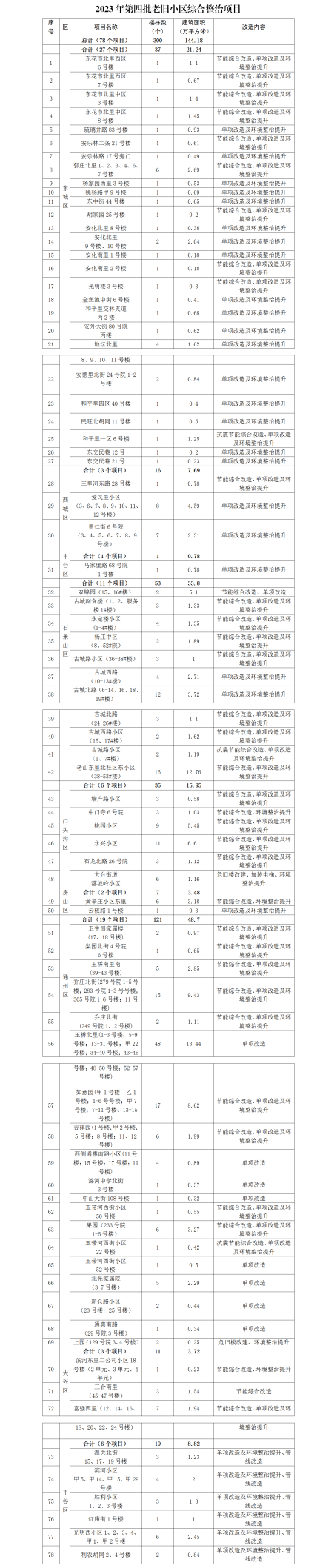 央廣網(wǎng)北京12月22日消息(記者門庭婷)12月22日,北京市住房城鄉(xiāng)建設(shè)委公布了2023年第四批老舊小區(qū)綜合整治項目名單,共有78個項目納入改造計劃,涉及改造樓棟數(shù)300棟,2萬戶,改造建筑面積144萬平方米。