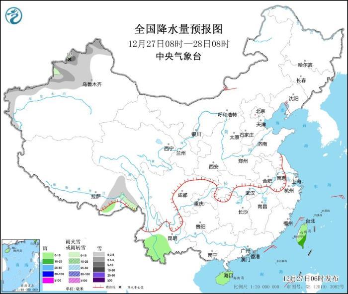 12月27日08時至28日08時,新疆北部、西藏東南部等地部分地區(qū)有小雪或雨夾雪,其中,新疆北疆北部和伊犁河谷等地部分地區(qū)有中到大雪,局地暴雪(10~12毫米)。云南西南部和中部、海南島、臺灣島等地部分地區(qū)有小雨,其中,臺灣島東部和南部等地部分地區(qū)有中雨。內(nèi)蒙古中東部、遼東半島等地部分地區(qū)有4~5級風(fēng)(見圖1)。