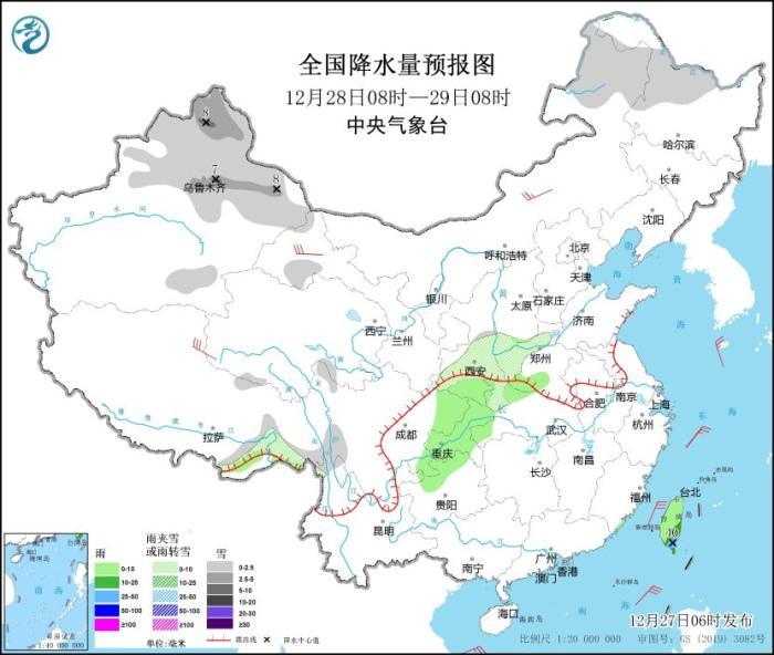 12月28日08時至29日08時,新疆北部、內(nèi)蒙古東北部、黑龍江西北部、西藏東南部、陜西中部等地部分地區(qū)有小雪或雨夾雪,其中,新疆沿天山地區(qū)和北疆北部等地部分地區(qū)有中到大雪(5~8毫米)。陜西南部、河南南部、西南地區(qū)東部、臺灣島等地部分地區(qū)有小到中雨,其中,臺灣島東部和南部等地部分地區(qū)有大雨(25~40毫米)。青海西部、甘肅河西、內(nèi)蒙古中部等地部分地區(qū)有5~6級風(fēng)(見圖2)。
