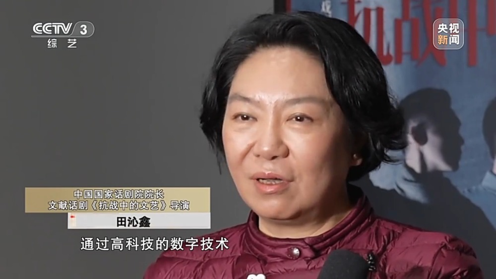 中國國家話劇院院長 文獻話劇《抗戰(zhàn)中的文藝》導演 田沁鑫:在舞臺方面,也是打破了時空的界限,通過高科技的數(shù)字技術(shù),影視化的多機位多角度的拍攝手法,將裝置影像藝術(shù)和戲劇表演藝術(shù)相融合,以戲劇電影的方式講好中國故事。