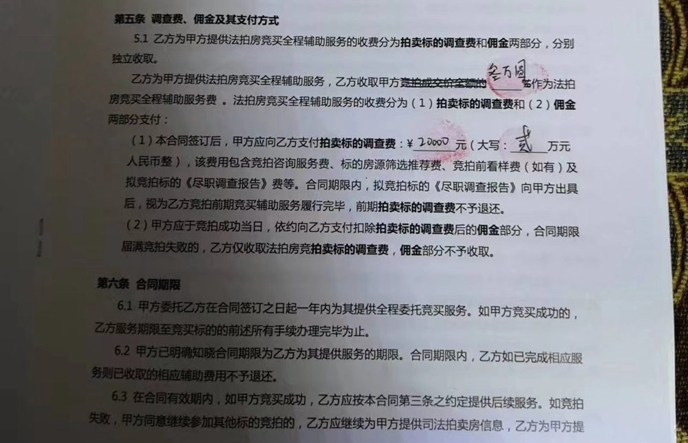 李先生說(shuō):“第一次說(shuō)給錢的時(shí)候我沒(méi)同意,他又帶我去看同戶型,看了家屬說(shuō)滿意,就上去叫我們交錢,承諾是包拍成功,但是合同寫(xiě)的時(shí)候只寫(xiě)了包過(guò)戶、包入住、包騰房,然后如果是拍成功過(guò)后,沒(méi)有成功入住,以房?jī)r(jià)的1.2倍回購(gòu),后面寫(xiě)了個(gè)‘調(diào)查服務(wù)費(fèi)’,就先交錢,交錢之后再給我們簽合同,說(shuō)你只要這次來(lái)簽了合同,第二次就來(lái)拍成功了,你交傭金1萬(wàn)塊,第三次就是你過(guò)來(lái)拿房產(chǎn)證、鑰匙,其他不用你操任何心?!?/p>