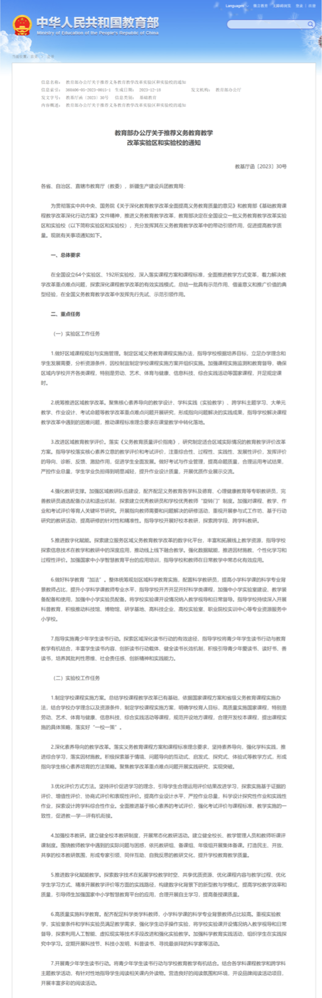 央廣網(wǎng)北京1月8日消息(記者 吳佳怡)近日,教育部辦公廳印發(fā)關(guān)于推薦義務(wù)教育教學(xué)改革實驗區(qū)和實驗校的通知,決定在全國設(shè)立一批義務(wù)教育教學(xué)改革實驗區(qū)和實驗校,并公示了義務(wù)教育教學(xué)改革實驗區(qū)和實驗校名單。