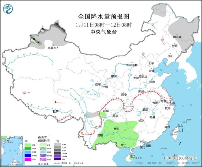 1月11日08時至12日08時,內(nèi)蒙古東北部、黑龍江大部、吉林東部、新疆北部、川西高原南部等地部分地區(qū)有小到中雪或雨夾雪,其中,新疆北部塔城、阿勒泰地區(qū)和伊犁河谷等地局地有大到暴雪(10~18毫米)。貴州中南部、云南東部、廣西、湖南西南部、海南島中部等地部分地區(qū)有小雨。內(nèi)蒙古中東部、河北北部等地部分地區(qū)有5~6級風(fēng);黃海中北部、臺灣海峽、巴士海峽、南海東北部和西南部等海域有6~7級風(fēng)、陣風(fēng)8級。