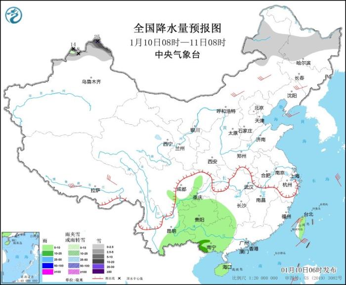 1月10日08時至11日08時,內(nèi)蒙古東部、黑龍江中北部、新疆北疆北部等地部分地區(qū)有小到中雪或雨夾雪,其中,新疆北疆塔城、阿勒泰地區(qū)等地有大到暴雪,局地大暴雪(20~25毫米)。四川盆地東南部、重慶西部、貴州、云南東部、廣西、湖南西南部、海南島、臺灣島東部等地部分地區(qū)有小到中雨。內(nèi)蒙古中部、遼寧北部等地部分地區(qū)有5~6級風(fēng);渤海、渤海海峽、黃海北部和南部、東海、臺灣海峽、臺灣以東洋面、巴士海峽、南海大部等海域有6~7級風(fēng)、陣風(fēng)8~9級。