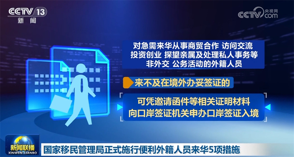 5項(xiàng)新舉措主要包括:放寬來華外籍人員申辦口岸簽證條件。對(duì)急需來華從事商貿(mào)合作、訪問交流、投資創(chuàng)業(yè)、探望親屬及處理私人事務(wù)等非外交、公務(wù)活動(dòng)的外籍人員,來不及在境外辦妥簽證的,可憑邀請(qǐng)函件等相關(guān)證明材料向口岸簽證機(jī)關(guān)申辦口岸簽證入境。