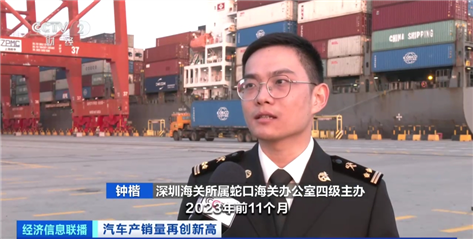 深圳海關(guān)所屬蛇口海關(guān)辦公室四級(jí)主辦 鐘楷:疊加提前申報(bào)抵港直裝,最大程度為企業(yè)降本提速。2023年前11個(gè)月,深圳市一共出口小汽車206.3億元,同比增長2倍多;其中電動(dòng)載人汽車190.8億元,占汽車出口總值的92.5%。