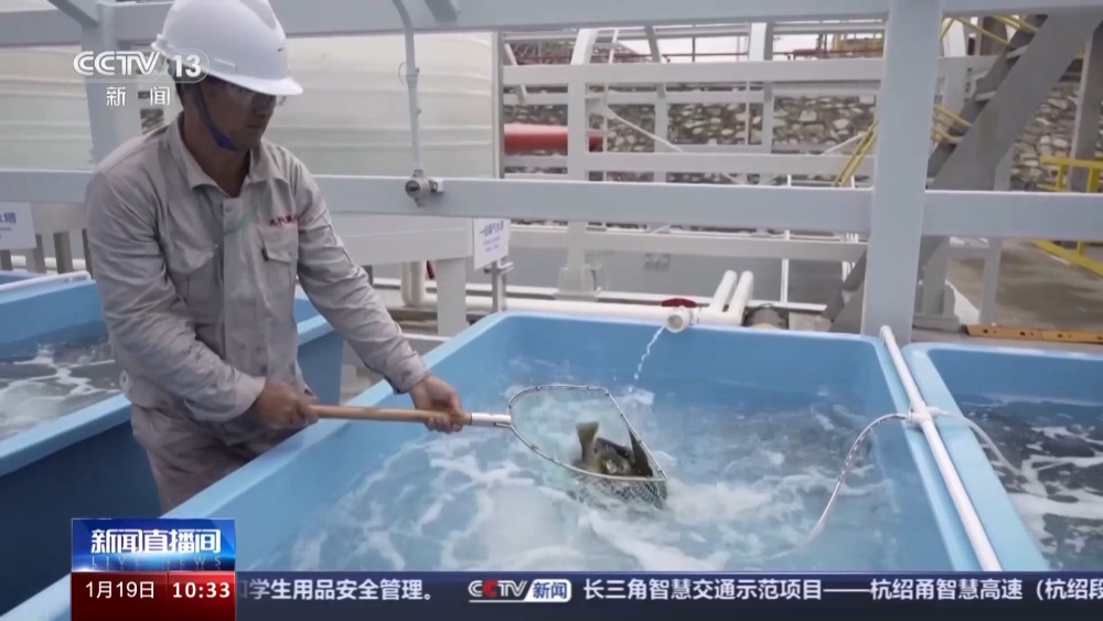 總臺(tái)央視記者 孫薊濰:我現(xiàn)在是在深圳的大鵬灣,身邊的這些藍(lán)色水箱里養(yǎng)殖著龍蝦、鮑魚等各種海鮮,養(yǎng)殖這些海產(chǎn)品的海水是廣東大鵬液化天然氣接收站的生產(chǎn)用水。