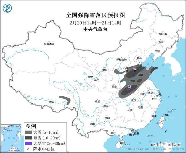 預計2月20日14時至2月21日14時,陜西北部、山西東南部、河北南部、山東、河南、安徽北部、湖北西部、西藏東部等地部分地區(qū)有大到暴雪,其中,河北南部、河南南部等地局地有大暴雪(20~22毫米)。上述部分地區(qū)新增積雪深度3~8厘米,局地可達12厘米以上。