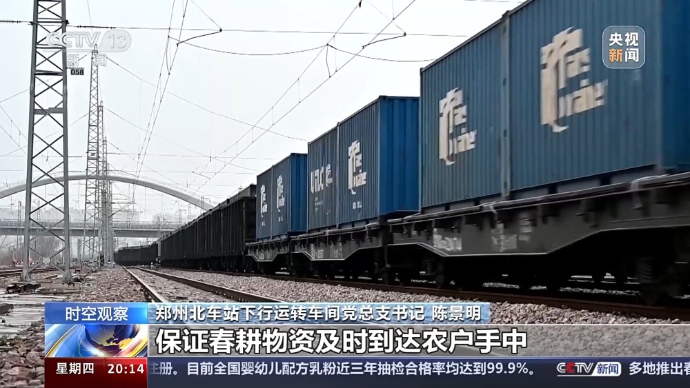 總臺(tái)央視記者 蔣樹林:這里是鄭州北車站,也是全國作業(yè)量最大的編組站,大家看我眼前這個(gè)車?yán)锩嫜b的就是當(dāng)下春耕所急需用的化肥原料,作業(yè)還在加班加點(diǎn)地往前推進(jìn)。