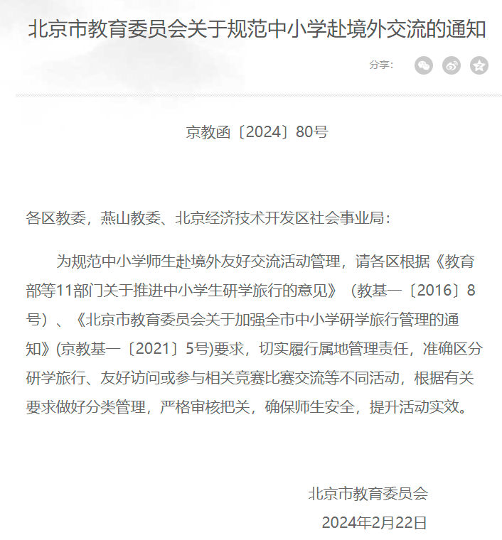 央廣網北京3月11日消息(記者馮儀)近日,北京市教委發(fā)布關于規(guī)范中小學赴境外交流的通知,通知中提到,請各區(qū)根據《教育部等11部門關于推進中小學生研學旅行的意見》(教基一〔2016〕8號)、《北京市教育委員會關于加強全市中小學研學旅行管理的通知》(京教基一〔2021〕5號)要求,切實履行屬地管理責任,準確區(qū)分研學旅行、友好訪問或參與相關競賽比賽交流等不同活動,根據有關要求做好分類管理,嚴格審核把關,確保師生安全,提升活動實效。