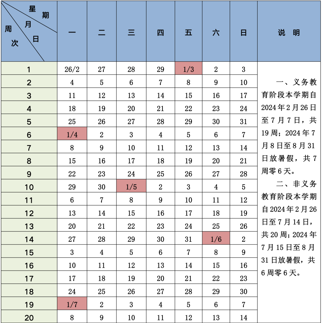 非義務(wù)教育階段第二學(xué)期于2024年2月26日(星期一)開學(xué);2024年7月14日(星期日)結(jié)束本學(xué)期工作,共20周;2024年7月15日(星期一)至8月31日(星期六)放暑假,共6周零6天。
