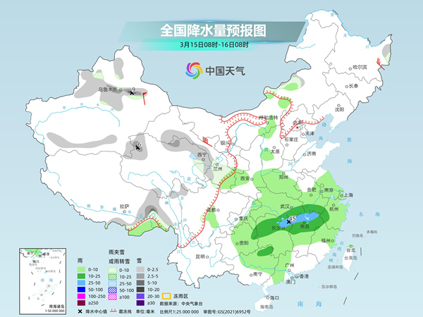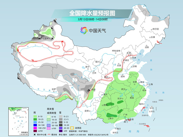 后天,內(nèi)蒙古中部、黑龍江東北部、新疆沿天山地區(qū)和南疆盆地北部、西藏東南部、青海北部和東部、甘肅中部和西南部等地部分地區(qū)有小雪或雨夾雪,其中,新疆沿天山地區(qū)、西藏東南部、青海北部等地部分地區(qū)有中雪,局地大雪(5~9毫米)。陜西中部、河南中西部、江淮大部、江漢、江南大部、四川盆地西南部、重慶東北部、貴州中東部、華南北部等地部分地區(qū)有小到中雨,其中,湖南東北部、江西北部等地部分地區(qū)有大雨(25~45毫米)。