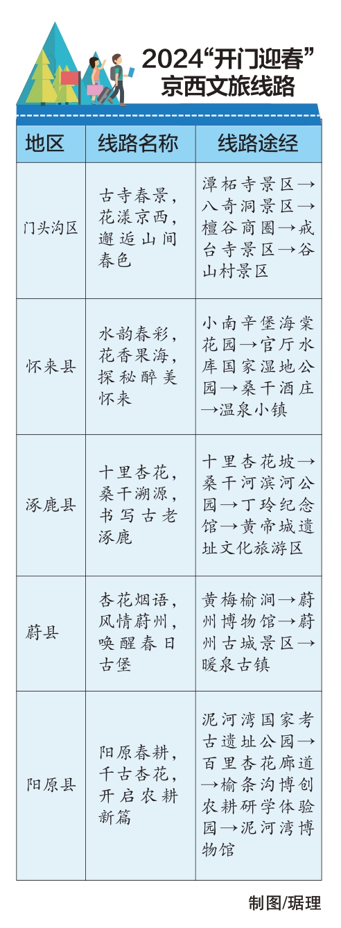 門頭溝區(qū)聯(lián)動(dòng)河北省張家口市懷來縣、涿鹿縣、蔚縣、陽原縣共同發(fā)布“詩畫京西春暉行”五條春游線路,圍繞踏青、賞花、徒步、騎行、露營、微度假等元素展開,為促進(jìn)京津冀消費(fèi)和北京一季度“開門紅”提供助力。