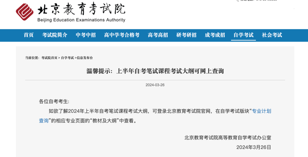 央廣網(wǎng)北京3月27日消息(記者 吳佳怡)據(jù)悉,2024年上半年自考筆試課程考試大綱可網(wǎng)上查詢??忌傻卿洷本┙逃荚囋汗倬W(wǎng),在自學考試版塊“專業(yè)計劃查詢”的相應專業(yè)頁面的“教材及大綱”中查看。