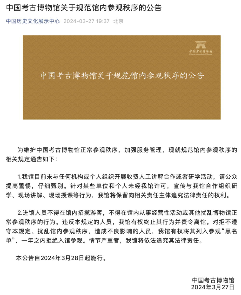 3月27日,中國(guó)考古博物館發(fā)布關(guān)于規(guī)范館內(nèi)參觀秩序的公告。