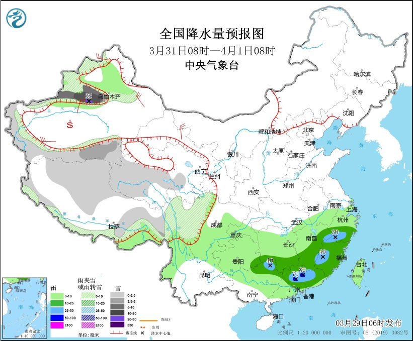 3月31日8時(shí)至4月1日8時(shí),新疆沿天山高海拔地區(qū)、西藏中北部、青海西部、川西高原等地部分地區(qū)有小到中雪或雨夾雪,其中,新疆沿天山地區(qū)和伊犁河谷等地部分地區(qū)有大到暴雪,局地大暴雪(20~25毫米)。浙江南部、江西東部和南部、湖南南部、貴州東南部、廣西東北部、廣東中北部、福建等地部分地區(qū)有中到大雨,其中,廣東北部等地部分地區(qū)有暴雨(50~80毫米)。新疆南疆盆地和東部、甘肅河西等地部分地區(qū)有4~6級(jí)風(fēng)。