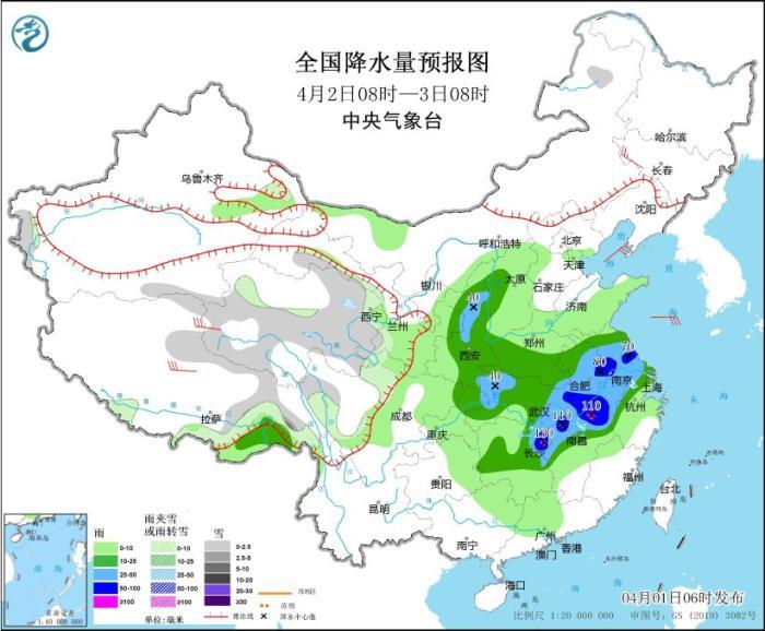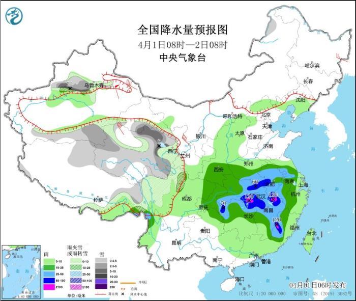 4月1日08時(shí)至2日08時(shí),新疆沿天山地區(qū)和南疆盆地、西藏北部和東部、青海大部、川西高原北部等地部分地區(qū)有小到中雪或雨夾雪,其中,新疆沿天山地區(qū)和南疆盆地、青海東北部等地部分地區(qū)有大到暴雪,新疆沿天山地區(qū)局地大暴雪(20~21毫米)。陜西東南部、河南中南部、安徽大部、江蘇中西部、四川東部、重慶大部、貴州東北部、湖北、湖南中北部、江西大部、浙江中西部、福建中西部等地部分地區(qū)有中到大雨,其中,河南南部、安徽中南部、湖北東部和南部、湖南北部和西部、江西北部和東南部、福建西部、重慶東南部等地部分地區(qū)有暴雨,局地大暴雨(100~120毫米)。內(nèi)蒙古西北部、新疆東部、青海西部、甘肅河西等地部分地區(qū)有4~6級風(fēng),其中,新疆東部部分地區(qū)有7~8級風(fēng),山口風(fēng)力可達(dá)11級以上。