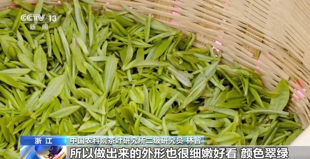 中國(guó)農(nóng)科院茶葉研究所二級(jí)研究員 林智:所以它有幾個(gè)特點(diǎn),第一個(gè)就是好看,為什么說(shuō)好看呢,因?yàn)榇禾觳璧难咳~比較細(xì)嫩,所以也比較金貴,做工一般都比較講究,做出來(lái)的外形也很細(xì)嫩好看,顏色翠綠。