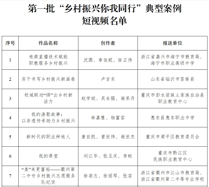 通知稱,根據(jù)《教育部辦公廳關于開展“鄉(xiāng)村振興你我同行”典型案例短視頻征集與宣傳活動的通知》(教職成廳函〔2023〕1號)要求,經(jīng)各地申報、網(wǎng)絡投票、專家評議、公示,現(xiàn)公布第一批“鄉(xiāng)村振興你我同行”典型案例短視頻名單。