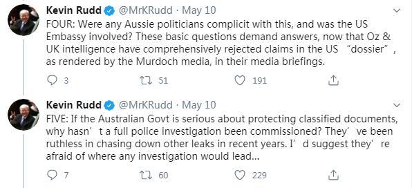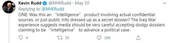 5月10日,陸克文在社交媒體再次連發(fā)五問(wèn),質(zhì)疑可能參與此次“甩鍋中國(guó)”事件的各方。他的第一問(wèn)稱(chēng),這所謂的15頁(yè)“情報(bào)”,究竟是源于真實(shí)的絕密情報(bào),還是根據(jù)公開(kāi)信息拼湊而成?他表示,“伊拉克戰(zhàn)爭(zhēng)的教訓(xùn)早已告誡媒體,必須謹(jǐn)慎對(duì)待所謂的‘情報(bào)’,以防陷入某種政治目的之中。”