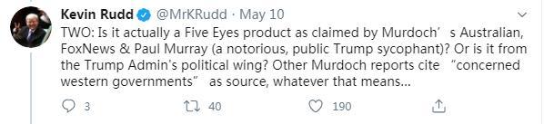 5月8日,陸克文更是在英國(guó)《衛(wèi)報(bào)》發(fā)表評(píng)論,揭批默多克旗下媒體的謊言,稱(chēng)其擬將焦點(diǎn)轉(zhuǎn)向中國(guó),為特朗普政府抗疫不力、造成眾多人員傷亡找借口,以助力特朗普連任。