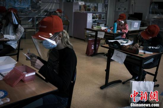 當?shù)貢r間5月12日,法國中部圣埃蒂安附近的拉格蘭德克羅伊市,當?shù)匦W生戴著統(tǒng)一發(fā)放的面罩上課。據(jù)報道,當?shù)貢r間5月11日,法國開始逐步“解封”,結(jié)束已經(jīng)持續(xù)55天的全國“封城”狀態(tài)。