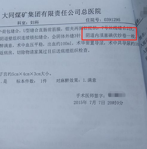 2015年7月,譚先生的母親曾在同煤集團(tuán)總醫(yī)院婦科做手術(shù)。他提供的一份落款日期為2015年7月7日的手術(shù)記錄顯示,其母在大同市煤礦集團(tuán)有限責(zé)任公司總醫(yī)院婦科做了“下行陰式子宮切除術(shù)+陰道前后壁修補(bǔ)術(shù)+尿道折疊術(shù)+盆腔粘連松解術(shù)”,縫合之后在“陰道內(nèi)填塞碘伏卷紗一枚”。