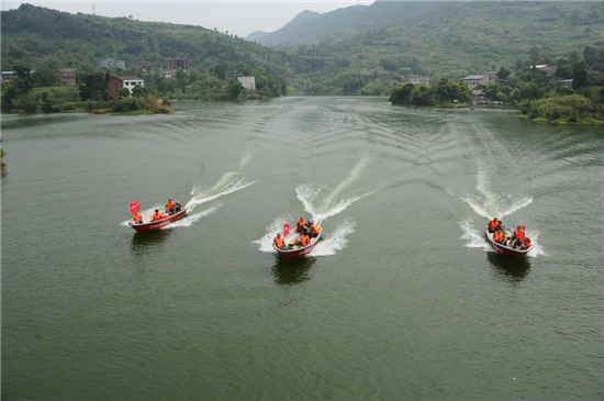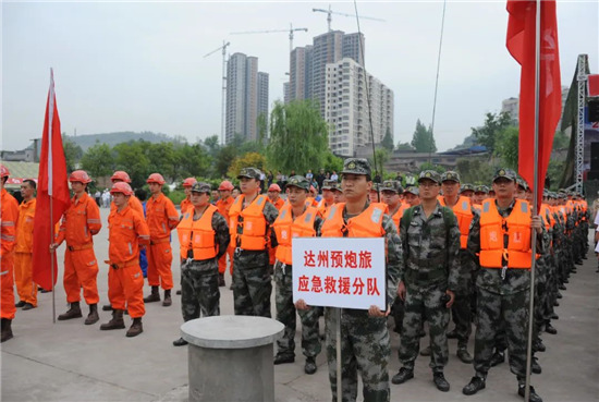 下午15時(shí),大竹縣烏木水庫大堤上,200余名預(yù)備役官兵身著橘色救生衣集結(jié)完畢,應(yīng)急分隊(duì)的紅旗迎風(fēng)招展,機(jī)關(guān)各科協(xié)調(diào)的保障力量也源源不斷往集結(jié)地域開進(jìn)。15時(shí)20分,應(yīng)急分隊(duì)已到達(dá)指定地域,救援物資全部到位。
