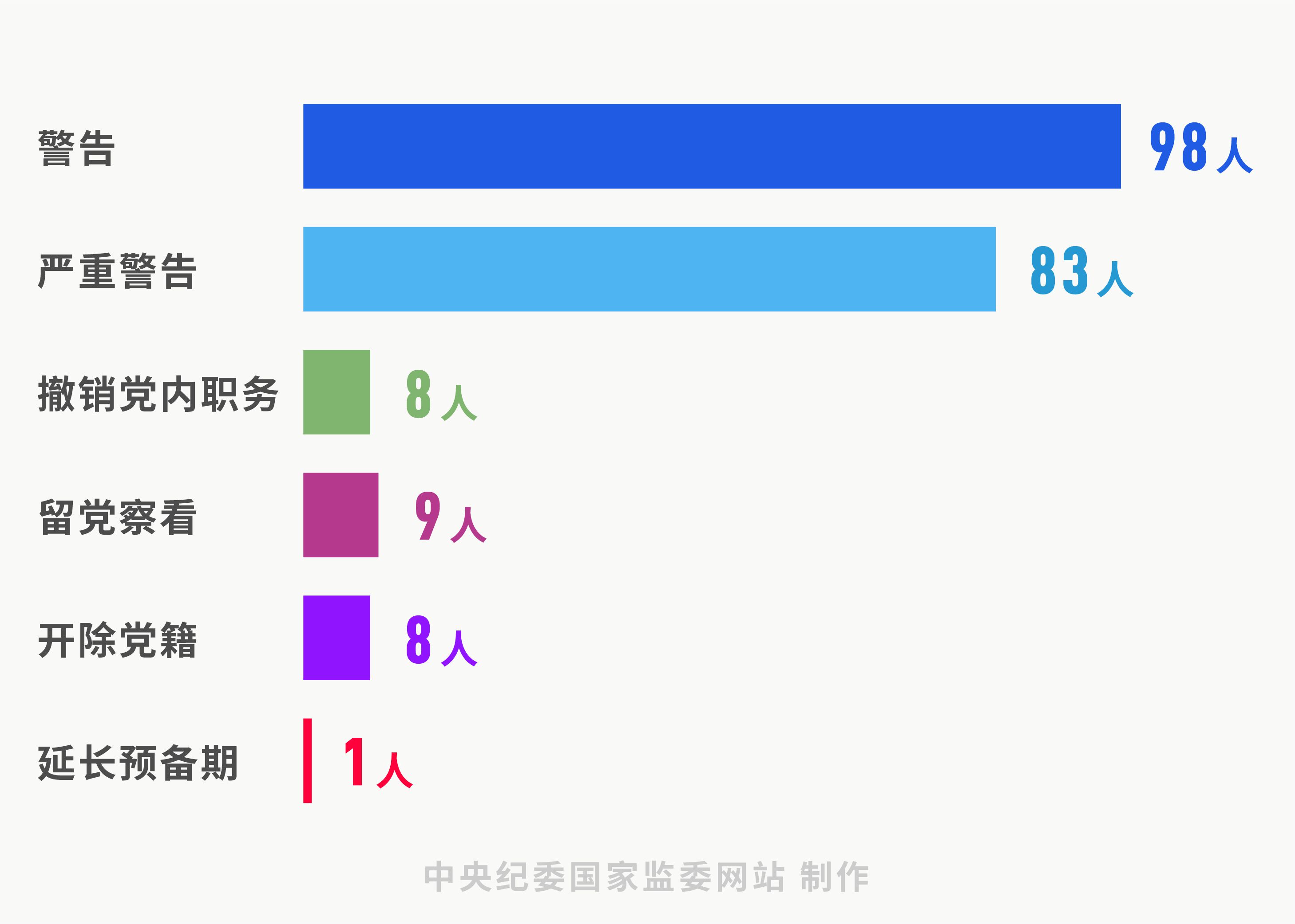 分析處分類型,受到黨紀(jì)處分的共計207人,其中,警告98人,嚴(yán)重警告83人,撤銷黨內(nèi)職務(wù)8人,留黨察看9人,開除黨籍8人,延長預(yù)備期1人;受到政務(wù)處分的共計42人,其中33人同時受到黨紀(jì)處分;12人受到誡勉談話、談話提醒、調(diào)離崗位等處理。運(yùn)用第一、二種形態(tài)處理人數(shù),占處理總?cè)藬?shù)的92%。用足用好“四種形態(tài)”,咬耳扯袖、紅臉出汗已成常態(tài),監(jiān)督執(zhí)紀(jì)更加精準(zhǔn),使更多干部受到警醒,體現(xiàn)的是嚴(yán)管和厚愛結(jié)合。
