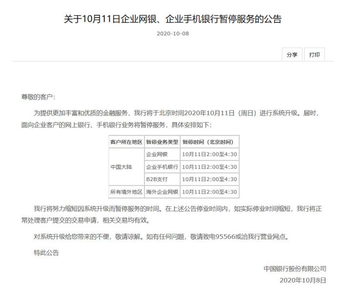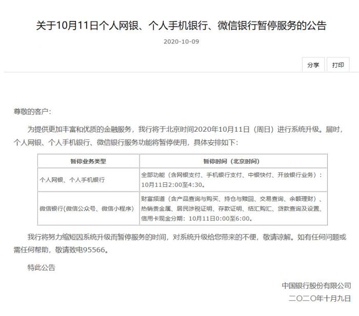 中國(guó)銀行11日暫停網(wǎng)銀和手機(jī)銀行服務(wù)
