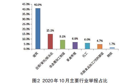 從行業(yè)類型來(lái)看,10月公眾反映最集中的行業(yè)為建筑業(yè),占40.9%;其次為住宿餐飲娛樂(lè)業(yè)和非金屬加工制造業(yè),分別占15.1%和9.1%。其中,建筑業(yè)占比比9月同類占比增加1.8%;非金屬加工制造業(yè)舉報(bào)占比比9月同類占比增加2.1%;住宿餐飲娛樂(lè)業(yè)舉報(bào)占比比9月同類占比減少0.3%,化工行業(yè)舉報(bào)占比比9月同類占比減少2.6%。